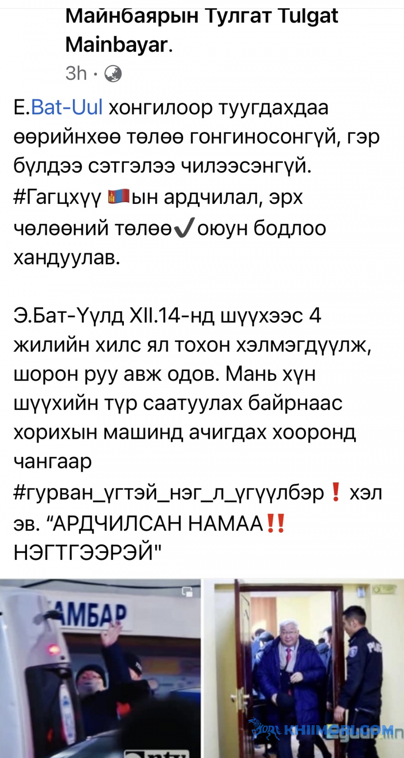 Би Монголын шүүхд итгэнэ. Бид шүүхдээ л итгэх ёстой. Гэхдээ БАТ-ҮҮЛЭЭС ӨӨР 850-Н ТЭРБУМЫГ МОНГОЛООС ХУЛГАЙЛСАН ХУЛГАЙЧ БАЙГАА. 347-Н ТЭРБУМ НИЙГМИЙН ДААТГАЛЫН МӨНГИЙГ ИДСЭН ХУЛГАЙЧ БАЙГАА, ЭРДЭНЭТИЙН 51-Н ХУВИЙГ АФРИКИЙН СТАНДАРТ БАНКИНД ТАВИАД 424 -Н ТЭРБУМ 267 Н САЯ ТӨГРӨГ АВЧ ИДЧИХЭЭД: НАДАД МӨНГӨ БАЙХГҮЙ. МИНИЙ ХОЁ ЧИХИЙГ АВБАЛ АВ ГЭЖ МОНГОЛЫН АРД ТҮМНИЙГ ДОРОМЖИЛЖ, САЙХАН ЯЛ ЗЭМГҮЙ ЗУГААЛЖ ЯВАА ХУЛГАЙЧ БАЙГАА, ОДОО БАС СУМЬЯАБАЗАР НИЙГМИЙН ДААТГАЛЫН 114 ТЭРБУМЫГ АВЧИХААД ӨГӨХГҮЙ БАЙГАА. Зүгээр сануулсан юм. Тэдэнд ч ижилхэн ял өгөх бизээ. Гэхдээ хотын дарга байхдаа Бат-үүл шиг өөрийнхөө хот гэж хичээж ажилласан өөр дарга байвал надад хэлээд өгөөрэй.