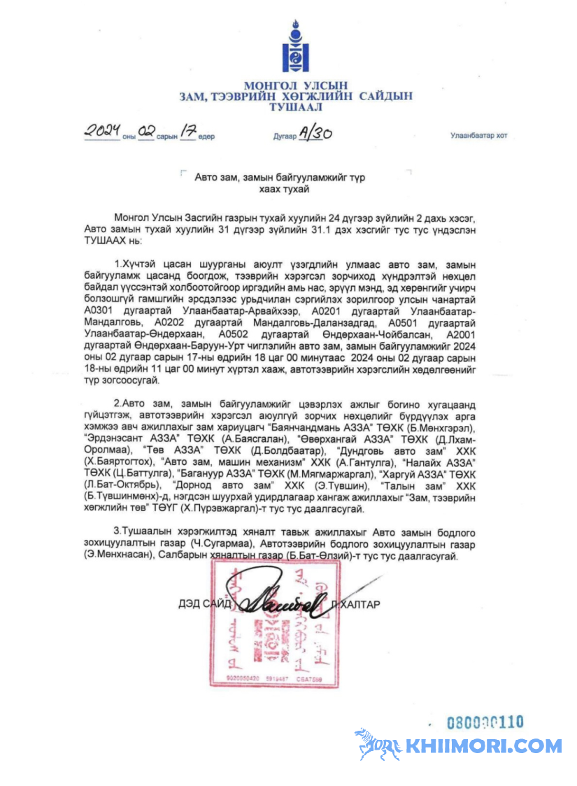 Хүчтэй цасан шуурганы аюулт үзэгдлийн улмаас авто зам, замын байгууламж цасанд боогдож, тээврийн хэрэгсэл зорчиход хүндрэлтэй болсон тул иргэдийн амь нас, эрүүл мэндийг болзошгүй эрсдэлээс сэргийлэх зорилгоор Улаанбаатар-Арвайхээр, Улаанбаатар-Мандалговь, Мандалговь-Даланзадгад, Улаанбаатар-Өндөрхаан, Өндөрхаан-Баруун-Урт, Өндөрхаан-Чойбалсан чиглэлийн авто замыг 2024 оны 02 дугаар сарын 18-ны өдрийн 11:00 цаг хүртэл түр хугацаанд хаах Зам, тээврийн хөгжлийн сайдын тушаал гарлаа.